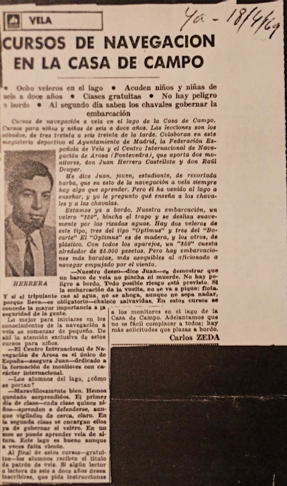 Cursos de navegación a vela en el lago de la Casa de Campo. Cursos para niños y niñas de seis a doce años. Las lecciones son los sábados, de tres treinta a seis treinta de la tarde. Colaboran en este magisterio deportivo el Ayuntamiento de Madrid, la Federación Española de Vela y el Centro Internacional de Navegación de Arosa (Pontevedra), que aporta dos monitores, don Juan Herrera Castellote y don Raúl Draper.